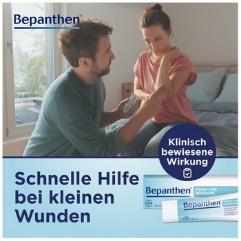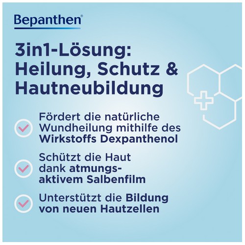 Bepanthen Wund- und Heilsalbe hilft bei kleinen Wunden, trockenen und rissigen Hautstellen, Schürfwunden, Kratzern, Schnitten und Schrunden. Selbst auf Schleimhäuten und im Intimbereich kann Bepanthen Wund- und Heilsalbe angewendet werden. Dabei fördert die Salbe die Produktion neuer Hautzellen und unterstützt so den Heilungsprozess.
