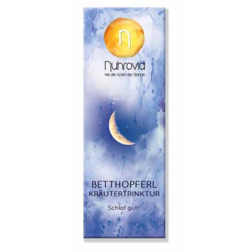 Betthopferl Kräutertrinktur beruhigt, entspannt und stärkt das Vertrauen, gut aufgehoben zu sein. Hopfen, Melisse, Lavendel und Himmelschlüssel entführen Sie sanft ins Reich der Träume. Sie bringen zur Ruhe, stärken die Nerven, unterstützen die Verdauung und fördern ganz allgemein einen guten Schlaf! Naturessenzen von Nuhrovia sind reine Naturprodukte, vegan, ohne Zusatzstoffe und daher besonders gut verträglich. Sie werden in Handarbeit aus Wildpflanzen hergestellt und über mehrere Wochen im Süden mit Sonnenlicht angereichert, daher ihr Name „Sonnenhellmittel“.