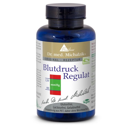 - Blutdruck Regulat nach Dr. med. Michalzik enthält OPC, Granatapfel, Arginin, Q10 und organisch gebundenes Kalium, welches zum Erhalt eines normalen Blutdrucks beiträgt. Dieser Effekt tritt ab 4 Kapseln pro Tag ein.