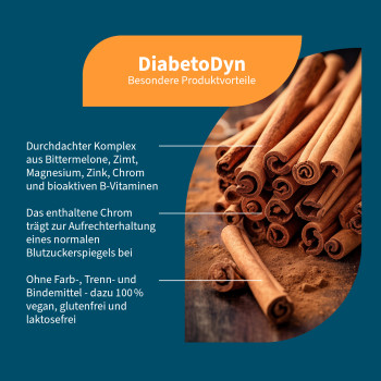 Bittermelonen-Extrakt, Zimt-Extrakt, Überzugsmittel: Hydroxypropylmethylcellulose (HPMC); Magnesiumcitrat, Magnesiumbisglycinat, Magnesiummalat, Zinkgluconat, Pyridoxal-5-Phosphat, Thiaminhydrochlorid, Chrompicolinat, Hydroxycobalamin, Adenosylcobalamin, Methylcobalamin.