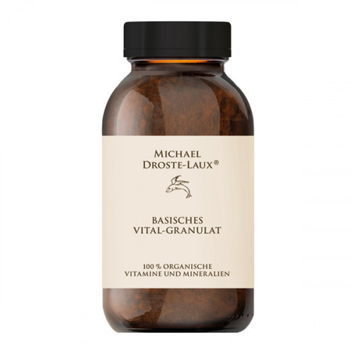 Michael Droste-Laux® Basisches Granulat ist ein Lebensmittel aus über 60 Zutaten. Die in pflanzlicher Form enthaltenen Mineralstoffe, Spurenelemente und Vitamine werden vom Organismus optimal aufgenommen. Das Basen bildende Granulat ist eine charakteristische Kostbarkeit. Die 49 Kräuter- Gewürz- Mischung, Kürbiskerne, Weizenkeime, fermentiertes Getreide, Apfelgranulat, Karotten, Mandelmehl, Sonnenblumenkerne, Topinambur, Walnüsse, Fenchel und Rote Beete stammen aus kontrolliert biologischem Anbau.