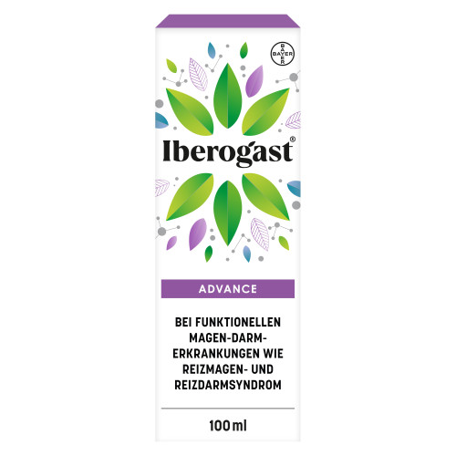 Iberogast® ADVANCE. Pflanzliches Arzneimittel bei Magen-Darm-Erkrankungen. Behandlung von funktionellen Magen-Darm-Erkrankungen wie Reizmagensyndrom (funktionelle Dyspepsie) und Reizdarmsyndrom (Colon irritabile). Das Arzneimittel enthält 31 Vol.-% Alkohol. Stand: 12/2020. Bayer Vital GmbH, Kaiser-Wilhelm-Allee 70, 51373 Leverkusen, Deutschland.
