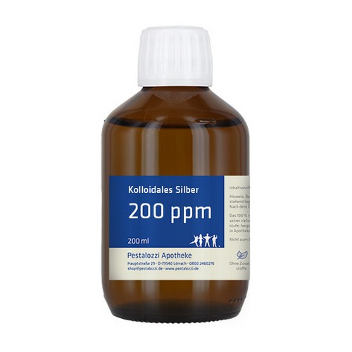 Das kolloidale Silber 200 ppm wird mit hochreinem destillierten Wasser unter qualifizierten Laborbedingungen frisch hergestellt und in einer dunklen Glasflasche geliefert. Die Herstellung erfolgt in der Apotheke unter überwachten Laborbedingungen. Das kolloidale Silber wird auf elektrolytischem Wege mit Hilfe eines entsprechenden Generators hergestellt. Dabei werden aus 99,99% reinem Silber kleinste Partikel gebildet und in destilliertem Wasser verteilt. Wir arbeiten dabei ohne Einsatz von Zusatzstoffen. Bitte beachten Sie: Kolloidales Silber ist kein Arzneimittel und daher auch ohne Angabe einer Indikation. Aus rechtlichen Gründen bieten wir daher das kolloidale Silber nur für technische Zwecke an. Nicht zum Einnehmen.