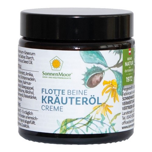 Die rein natürliche SonnenMoor Kräuterölcreme ist ideal für die Pflege von beanspruchter Haut und Beine. Mit ausgewählten Kräutern und Wirkpflanzen wie Arnika, Rosskastanie, Fichtennadeln, Wacholderbeeren, Kalmuswurzel, Käsepappel und besonders kostbarem Bockshornsamenöl fördert die Kräuterölcreme die Durchblutung der Beine. Schon Hildegard von Bingen schwörte auf Bockshornsamenöl für frische Beine und vitale Venen. Als Basis der Kräuterölcreme dienen Sheabutter und ökologisches Palmfett, natürlich aus streng kontrolliertem, zertifiziertem Anbau. Selbstverständlich ist unsere Creme vollkommen frei von chemischen Zusätzen. Verwöhnen und vitalisieren Sie Ihre Beine mit der Kräuterölcreme für mehr Leichtigkeit und Wohlbefinden.