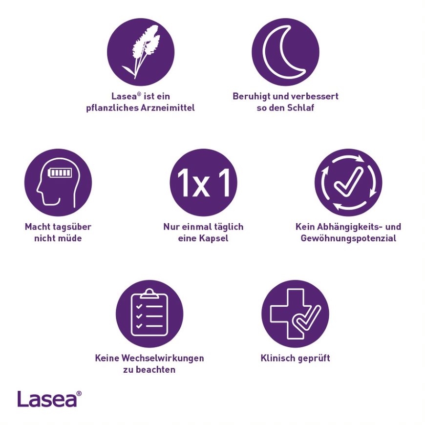 Die Wirksamkeit von Lasea konnte bereits in mehr als 15 klinischen Studien mit mehr als 2.500 Patienten/Probanden bewiesen werden. * Das Arzneimittel macht weder abhängig noch tagsüber müde. Das Präparat beeinflusst damit auch nicht die Konzentration und Fahrtüchtigkeit. Den gefürchteten, sogenannten Hangover gibt es bei Lasea nicht. Hangover bezeichnet die Morgen- bzw. Tagesmüdigkeit, die viele chemisch-synthetische, aber auch pflanzliche Beruhigungs- und Schlafmittel am nächsten Tag nach sich ziehen können.