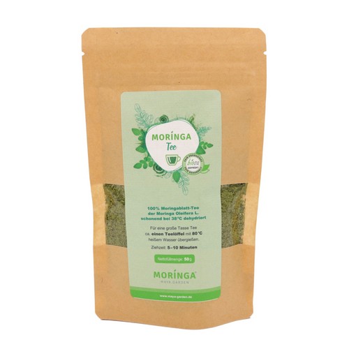 Moringablätter in ein Teesieb füllen. Um die wertvollen Inhaltsstoffe zu erhalten und sicherzustellen, dass sie nicht zerstört werden, heißes Wasser mit einer Temperatur von nicht mehr als 80 ° C verwenden. Den Tee 5 Minuten im Wasser ziehen lassen, um den bestmöglichen Geschmack zu erzielen. Der Tee kann mit Honig, Zitronensaft oder Minze geschmacklich verbessert werden.
