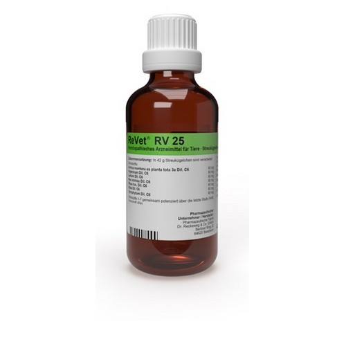 - ReVet®RV -Serie für alle Tierarten, auch für lebensmittelliefernde Tiere. Packungsgröße: 42 g Globuli.