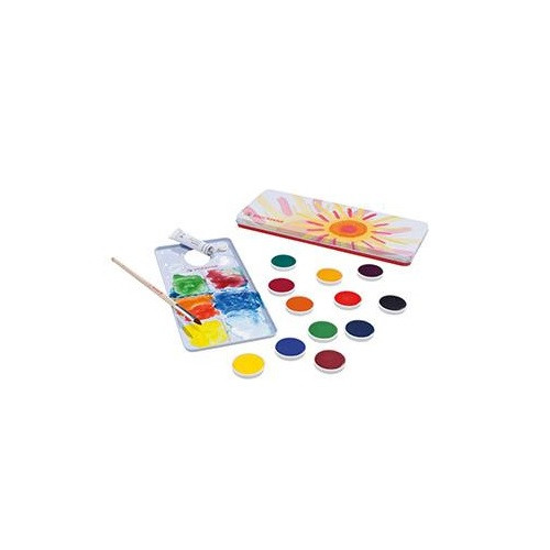 Die STOCKMAR Deckfarben bestehen aus zwölf Deckfarben, Deckweiss, Pinsel und einer Mischpalette.