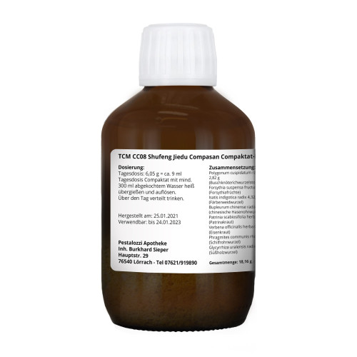 Aufgrund des Interesses an TCM werden chinesischen Kräuterarzneien in Apotheken seit Jahrzehnten auch in Europa hergestellt. CC08 Shufeng Jiedu ist ein apothekenpflichtiges Rezepturarzneimittel. Dieses Produkt wird als Rezeptur im Labor der Pestalozzi Apotheke für Sie hergestellt. Dabei wird das Verfahren nach CompaSan Compaktate verwendet. Das Verfahren gilt als neuartig und innovativ bei der Herstellung hochkonzentrierter Heilpflanzen-Spezialextrakte.